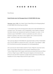 The Supervisory Board of HUGO BOSS AG appointed Grieder as CEO of HUGO BOSS AG on June 16, 2020, for a period of five years. In the interim, since October 1, 2020, CFO Yves Müller has served as Spokesperson for the Managing Board. Until June last year, Daniel Grieder worked for Tommy Hilfiger for more than twenty years. He was largely responsible for the successful establishment of the Tommy Hilfiger brand in the European market and was named Chief Executive Officer of Tommy Hilfiger Europe in 2008. Following the integration of the brand into the Phillips-Van Heusen (PVH) Corporation, Grieder became Chief Executive Officer and President of Tommy Hilfiger Global and PVH Europe in 2014.