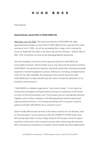 The Supervisory Board of HUGO BOSS AG today appointed Daniel Grieder as future CEO of HUGO BOSS AG for a period of five years starting on June 1, 2021. He will be succeeding Mark Langer, who is leaving the Group on September 30, 2020. In the interim period, from October 1, 2020 to May 31, 2021, CFO Yves Müller will serve as the Managing Board's spokesman.