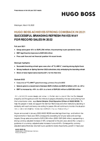“With our strong comeback in 2021, we successfully kicked off our ‘CLAIM 5’ strategy,” says Daniel Grieder. “Right from its start, our growth strategy fueled brand momentum around the globe. The highly successful branding refresh and ongoing investments will further drive relevance for BOSS and HUGO in the current year. We have everything it takes to reach record sales in 2022. As a team, we will take a big step closer towards our goal of becoming one of the top 100 global brands.”