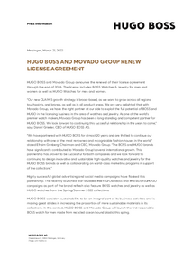 HUGO BOSS and Movado Group announce the renewal of their license agreement through the end of 2026. The license includes BOSS Watches & Jewelry for men and women as well as HUGO Watches for men and women.