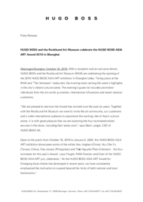 Metzingen/Shanghai, October 18, 2019. With a reception and an exclusive dinner, HUGO BOSS and the Rockbund Art Museum (RAM) are celebrating the opening of the 2019 HUGO BOSS ASIA ART exhibition in Shanghai today. Taking place at the RAM and “The Hakkasan” restaurant, the evening ranks among the week’s highlights in the city’s vibrant cultural scene. The evening’s guest list includes prominent individuals from the art world, journalists, international influencers and select national customers.