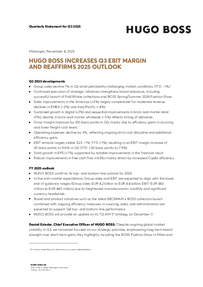 Daniel Grieder, Chief Executive Officer of HUGO BOSS: “Despite ongoing global market volatility in Q3, we remained focused on our strategic priorities, emphasizing long-term brand strength over short-term gains. Key highlights, including the BOSS Fashion Show in Milan and the second BECKHAM x BOSS collection, further elevated our global brand relevance and supported top-line performance. In this context, we are particularly encouraged by the sequential improvement in our direct-to-consumer business, as both digital sales and retail improved slightly. At the same time, we achieved meaningful efficiency gains, delivering notable gross margin expansion and streamlined expenses. This is clear evidence of the operational excellence and resilience at the core of our business model. Accordingly, we confirm our 2025 top- and bottom-line guidance, while remaining vigilant in navigating ongoing market uncertainties, including high currency fluctuations.