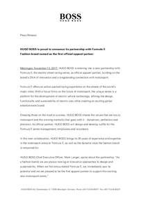 Metzingen, November 13, 2017. HUGO BOSS is entering into a new partnership with Formula E, the electric street racing series, as official apparel partner, building on the brand’s DNA of innovation and a longstanding connection with motorsport.