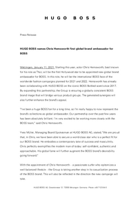 Yves Müller, Managing Board Spokesman at HUGO BOSS AG, stated, "We are proud that, in Chris, we have been able to secure a world-class star who is a perfect fit for our BOSS brand. He embodies a contemporary take of success and masculinity. Chris perfectly exemplifies the modern man of today: self-confident, authentic and approachable. His global fame will further augment the BOSS brand's desirability going forward."