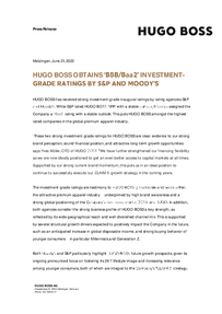 HUGO BOSS has received strong investment-grade inaugural ratings by rating agencies S&P and Moody’s. While S&P rated HUGO BOSS ‘BBB’ with a stable outlook, Moody’s assigned the Company a ‘Baa2’ rating with a stable outlook. This puts HUGO BOSS amongst the highest-rated companies in the global premium apparel industry.