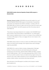 Metzingen, February 13, 2018.HUGO BOSS announces the transfer of its Level 1 American Depositary Receipt (ADR) program to Deutsche Bank. Deutsche Bank assumed the role of depositary bank effective yesterday. Launched in 2013, the HUGO BOSS ADR will continue to trade on the over-the-counter (OTC) market under the ticker symbol BOSSY. Each ADR represents one-fifth of the ordinary share of HUGO BOSS AG.
