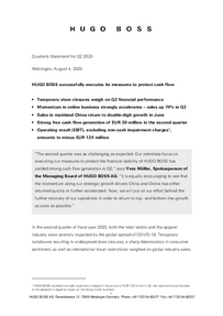 “The second quarter was as challenging as expected. Our relentless focus on executing our measures to protect the financial stability of HUGO BOSS has yielded strong cash flow generation in Q2,” says Yves Müller, Spokesperson of the Managing Board of HUGO BOSS AG. “It is equally encouraging to see that the momentum along our strategic growth drivers China and Online has either returned quickly or further accelerated. Now, we will put all our effort behind the further recovery of our operations in order to return to top- and bottom-line growth as soon as possible.”