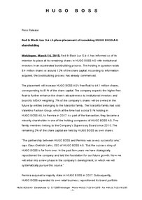 Metzingen, March 16, 2015. Red & Black Lux S.à r.l. has informed us of its intention to place all its remaining shares in HUGO BOSS AG with institutional investors in an accelerated bookbuilding process. The holding in question totals 8.4 million shares or around 12% of the share capital. According to information acquired, the bookbuilding process has already commenced.