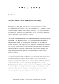 The Group expects the "Threedom of Work" provisions to be broadly embraced and widely used, and anticipates that comparable models will be adopted shortly at its international subsidiaries. HUGO BOSS employs some 14,600 people in 60 subsidiaries around the world.
